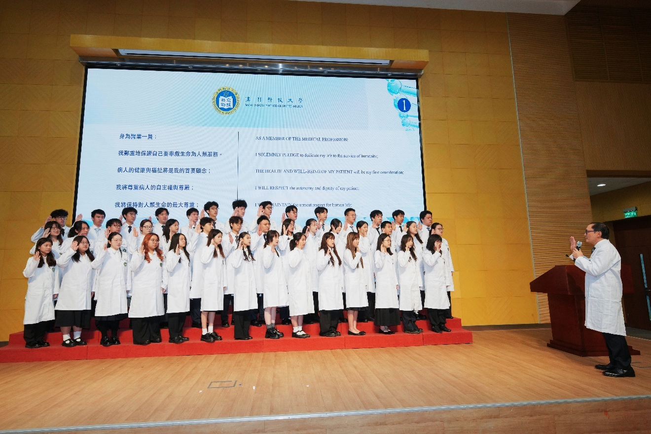 澳門科技大學醫學院於2025年9月27日上午10:30在N101大禮堂舉行一年級內外全科醫學學士學位課程宣言及宣誓儀式。新生與嘉賓、師長齊聚一堂,共同見證重要時刻。