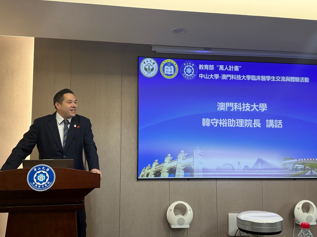 最后,由澳门科技大学医学院助理院长韩守裕副教授代表医学院致辞。首先,韩副教授向中山大学附属第五医院表达最诚挚的感谢,感谢他们一直以来对澳门科技大学医学院的支持与付出。他指出,医学院能够安排五年级和六年级医学生到中大五院进行临床培训,对学院整体医学课程的发展发挥了关键而深远的作用。其后,韩副教授勉励在场学生珍惜此次宝贵的经验,鼓励他们善用此次机会向经验丰富的临床医生学习,了解不同的医疗体系,提升自身的临床推理能力、职业素养和团队合作能力。希望学生们能以求知的态度、谦逊的精神和追求卓越的决心来对待这次交流项目。