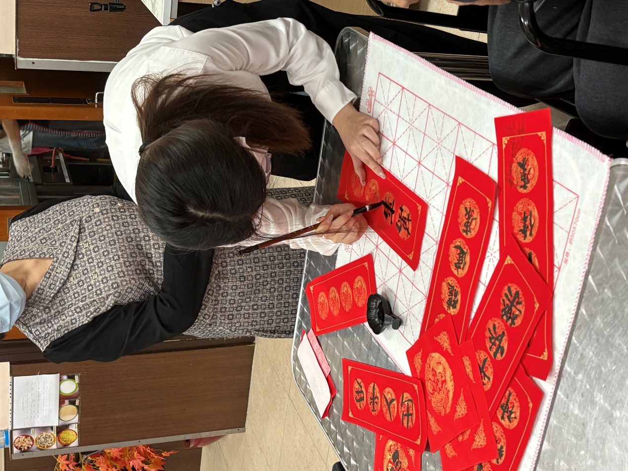 為慶祝中國新年,在檢查環節結束後,醫學生與長者共同撰寫春聯,在條幅上寫滿了吉祥祝福。這種跨代互動活動營造了熱鬧而有意義的節慶氛圍,促進了文化交流與社交聯結。