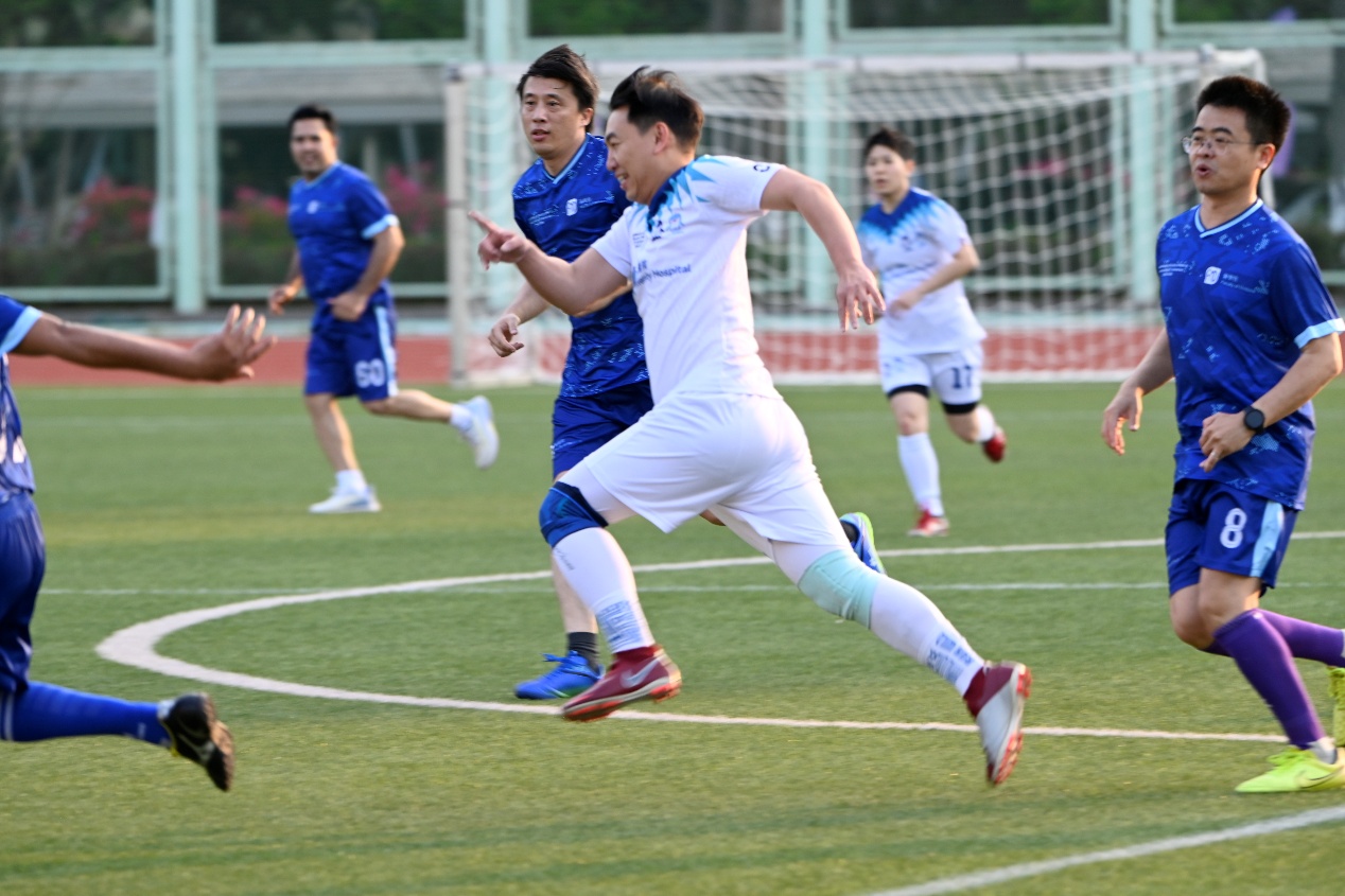 比赛过程中,双方球员拼搏认真、配合默契,场上既有精彩的传球组织与射门瞬间,亦不乏友好的交流与致意,充分体现了「友谊第一、比赛第二」的体育精神。现场观众热情打气,气氛欢乐融洽。经过一番激烈角逐,医学院代表队展现出凌厉攻势,最终以5比2的比分获胜。值得一提的是,朱健康校长不仅亲临现场支持,更亲自披甲上阵,并在比赛中攻入一记精彩进球,引来全场掌声与喝采。